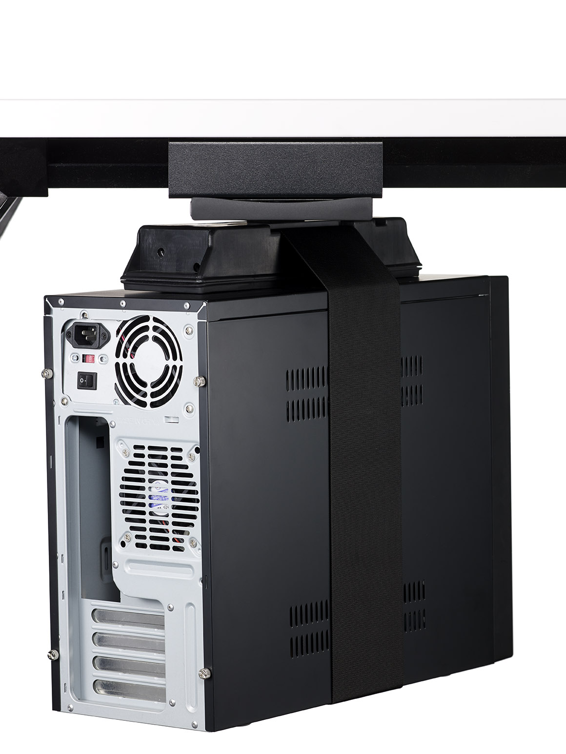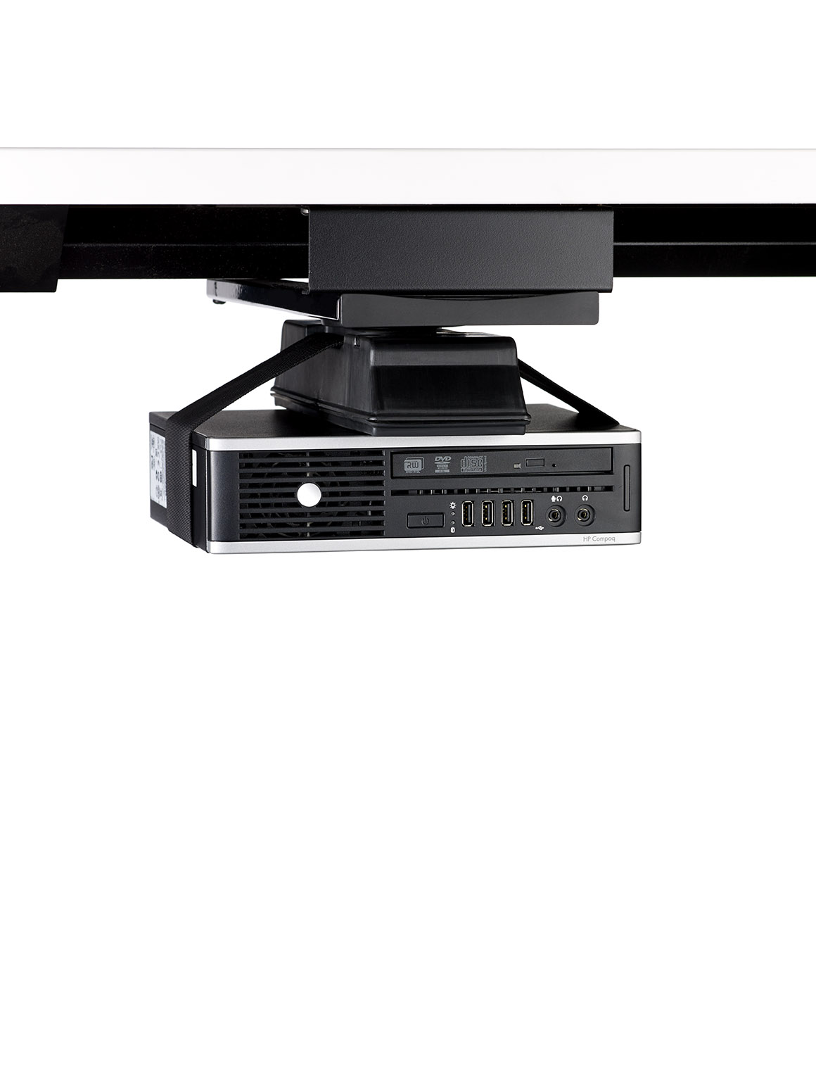 Knoll CPU Holders mount to the underside of most worksurfaces in order to maximize desktop and floor space. Designed to swivel 360 degrees, the bracket enables easy access to ports and cables without removing the CPU from the sliding track. The holder is available in either nylon or steel.
