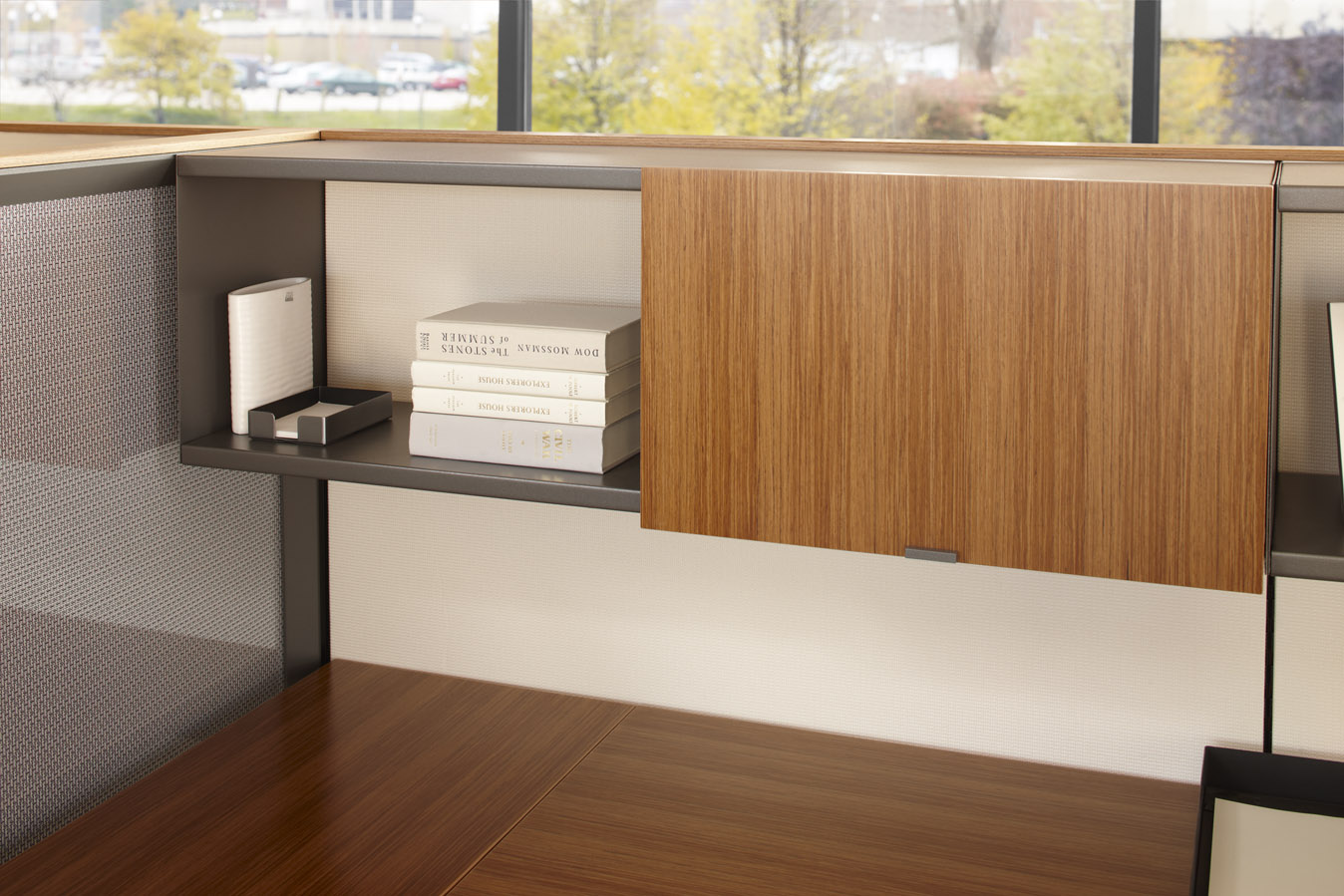 19512 | Dividends Skyline System with Shelving, Credenza, and Panel Mounted Height-Adjustable Table
