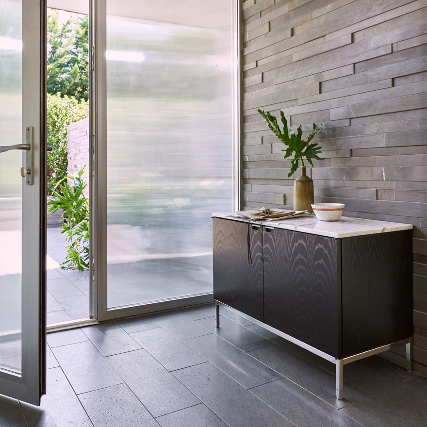 Seeking to create a space better suited to the executive’s primary function — communication — Florence reconsidered the illogical layout from an architectural perspective. She eliminated the imposing desk, replacing it with the more inviting table desk, placed parallel to the back wall. Storage was moved to behind the table in a low, matching credenza.