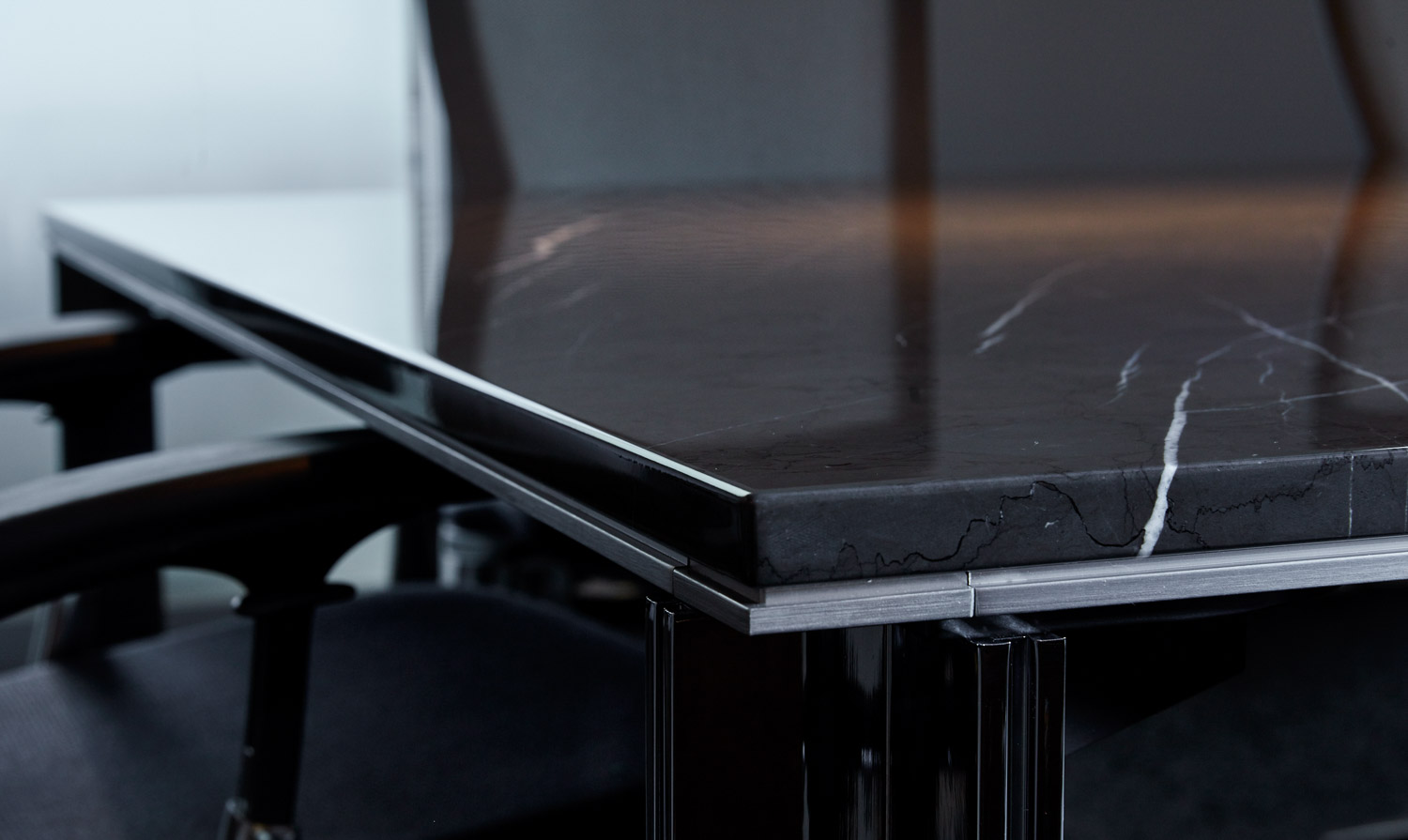 • BOLD STYLING. Striking material options include anodized and chromed aluminum, laminated glass, plastic laminate, polished and painted steel, natural and engineered stones, and sustainable veneers. Accent aluminum edges provide a rich visual connection between worksurface and base.