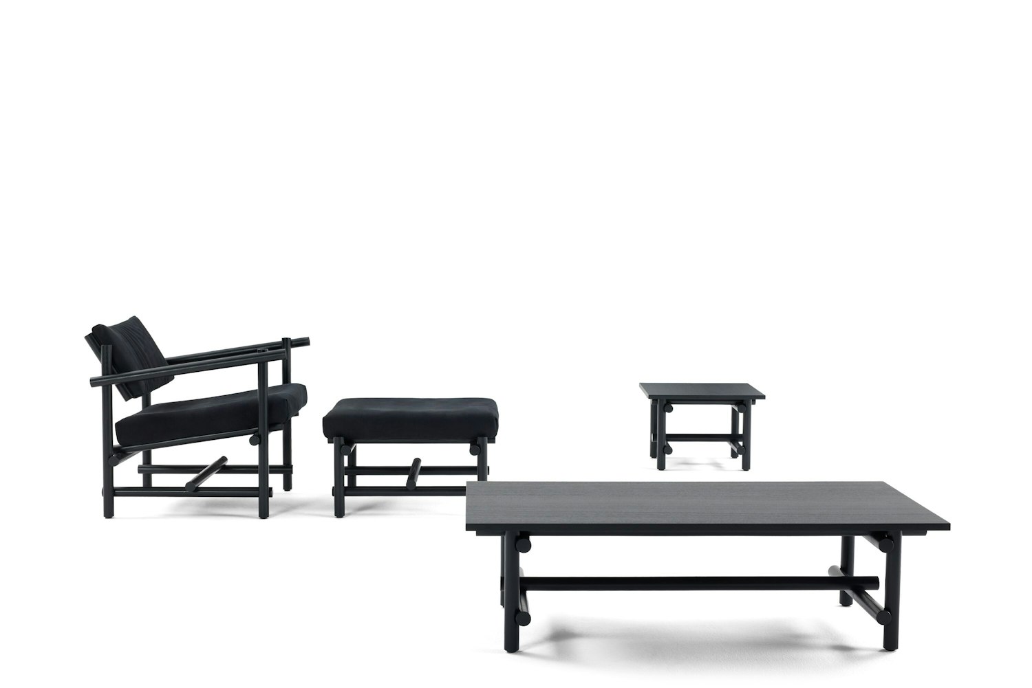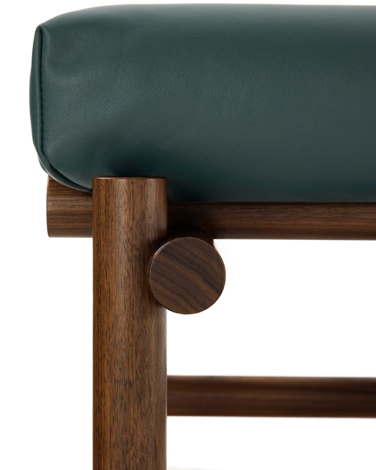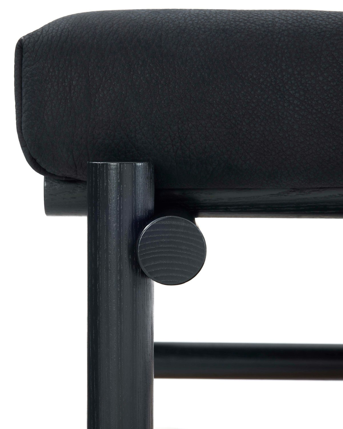Muecke developed a distinct joinery system that repeats throughout the collection. Rounded dowels pass on adjacent planes, connected where they meet by a floating tenon.