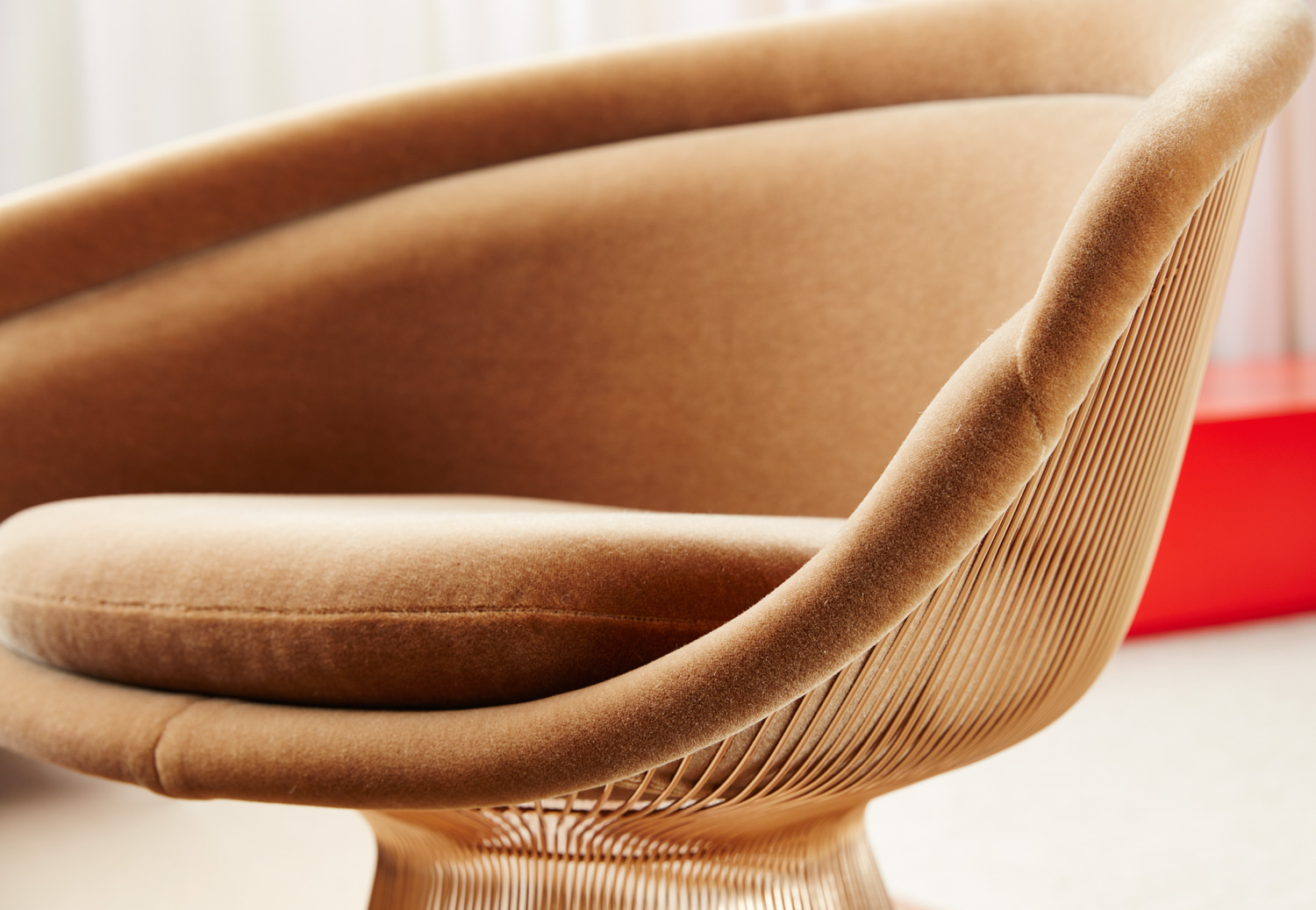 Originally introduced by Knoll in 1966, the Platner Collection is an icon of modern furniture. Platner personally formulated the production techniques for the complicated designs with each chair requiring over a thousand welds and more than one hundred cylindrical steel rods.