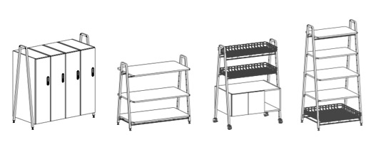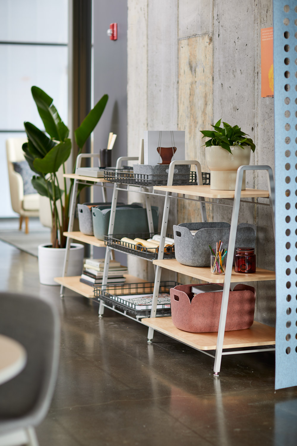 Rockwell Unscripted modular storage serves as a creative toolbox with a full range of open and enclosed storage elements in an eclectic mix of materials, which can be linked together to delineate and activate space. Modular components include shelves, removable baskets, cabinets, lockers, conversation boards, coat racks, and worksurfaces.