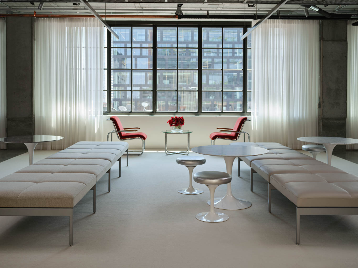 19127 | Knoll NYC Showroom with Florence Knoll Model 31 Chairs, Saarinen Lounge Height Table, and Tulip Stools