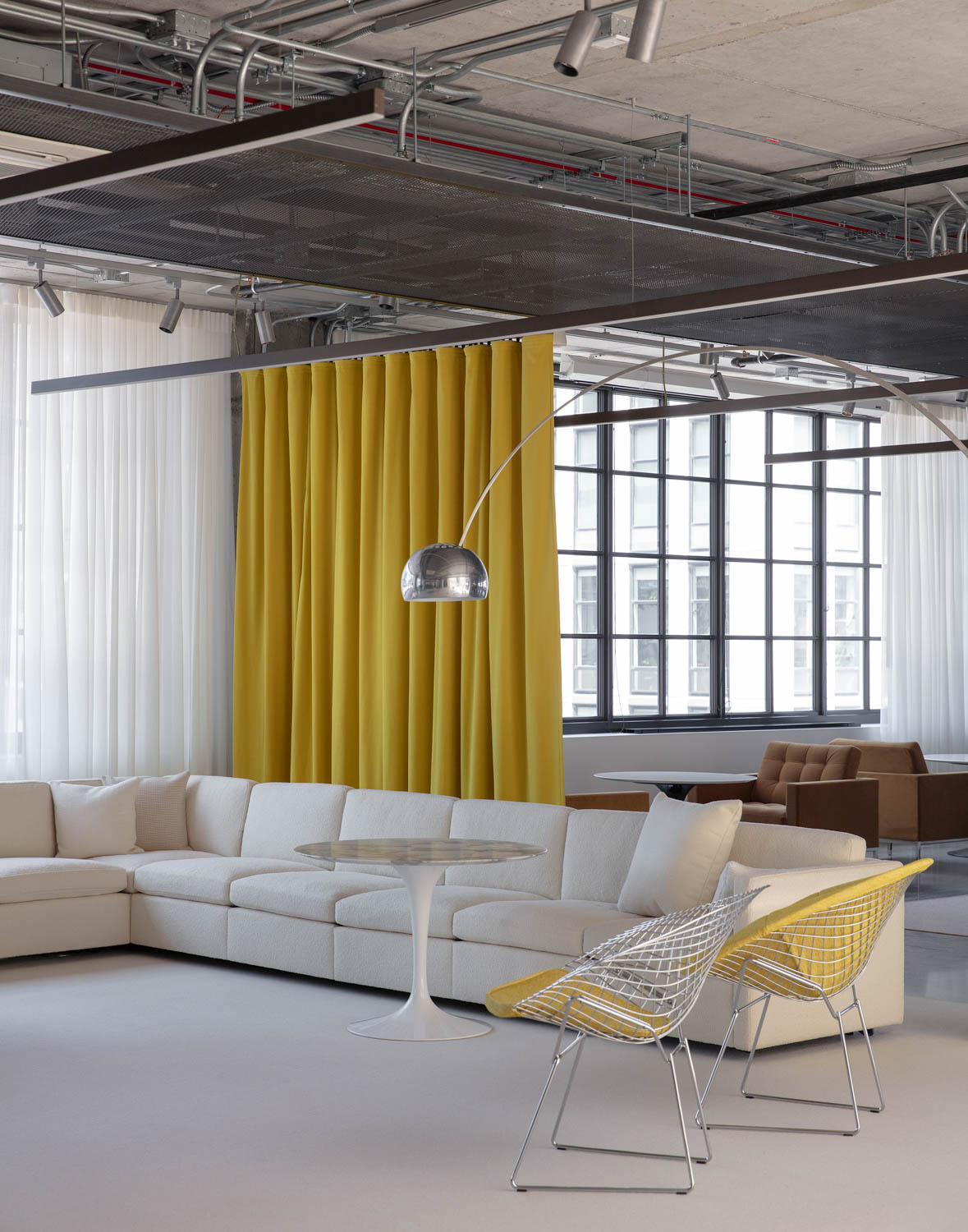 19252 | MillerKnoll San Francisco Showroom with D'Urso Swivel Chairs, Pfister Sofa, Bertoia Diamond Chair, Saarinen Lounge Height Table, and Tulip Stools