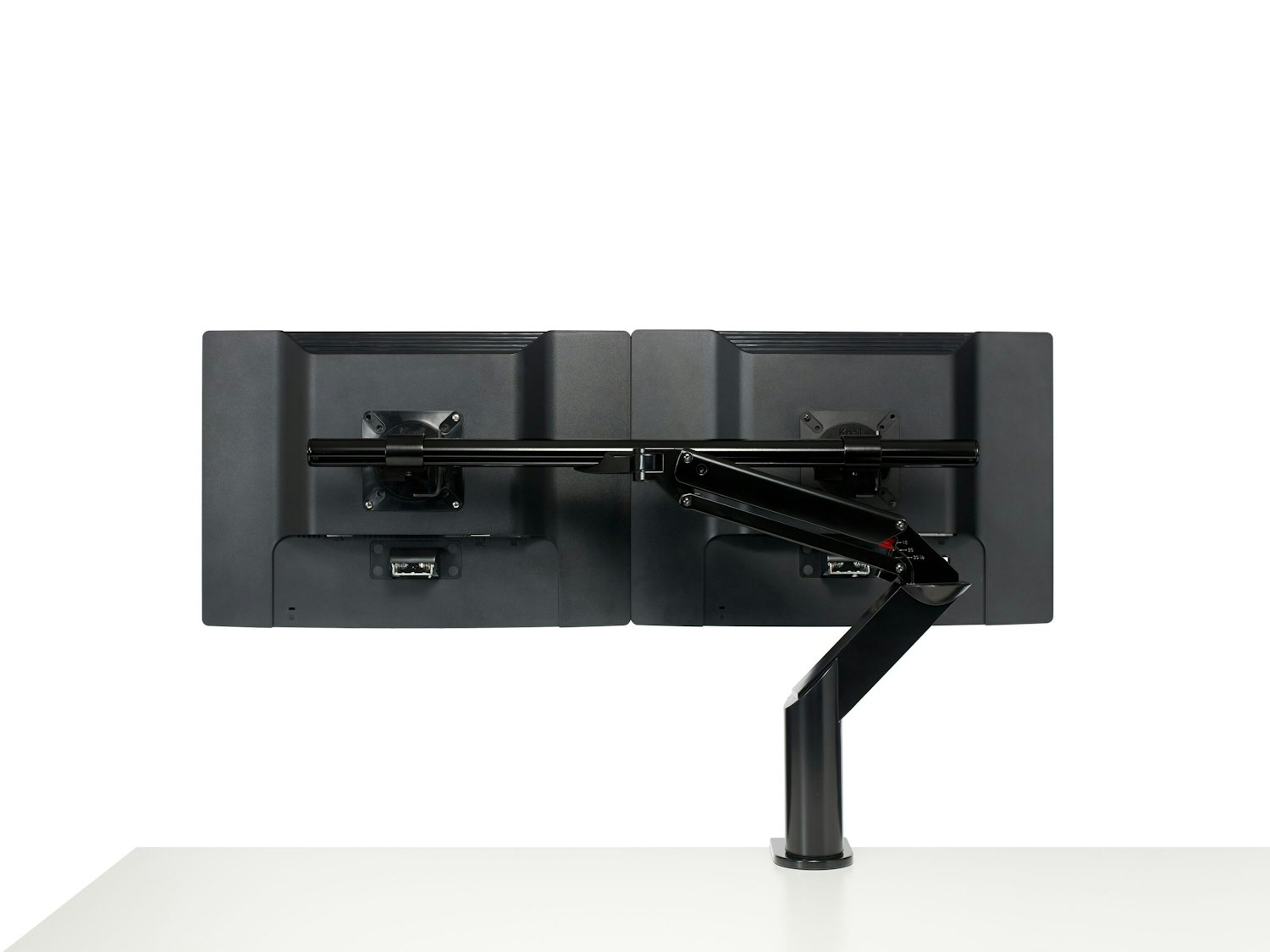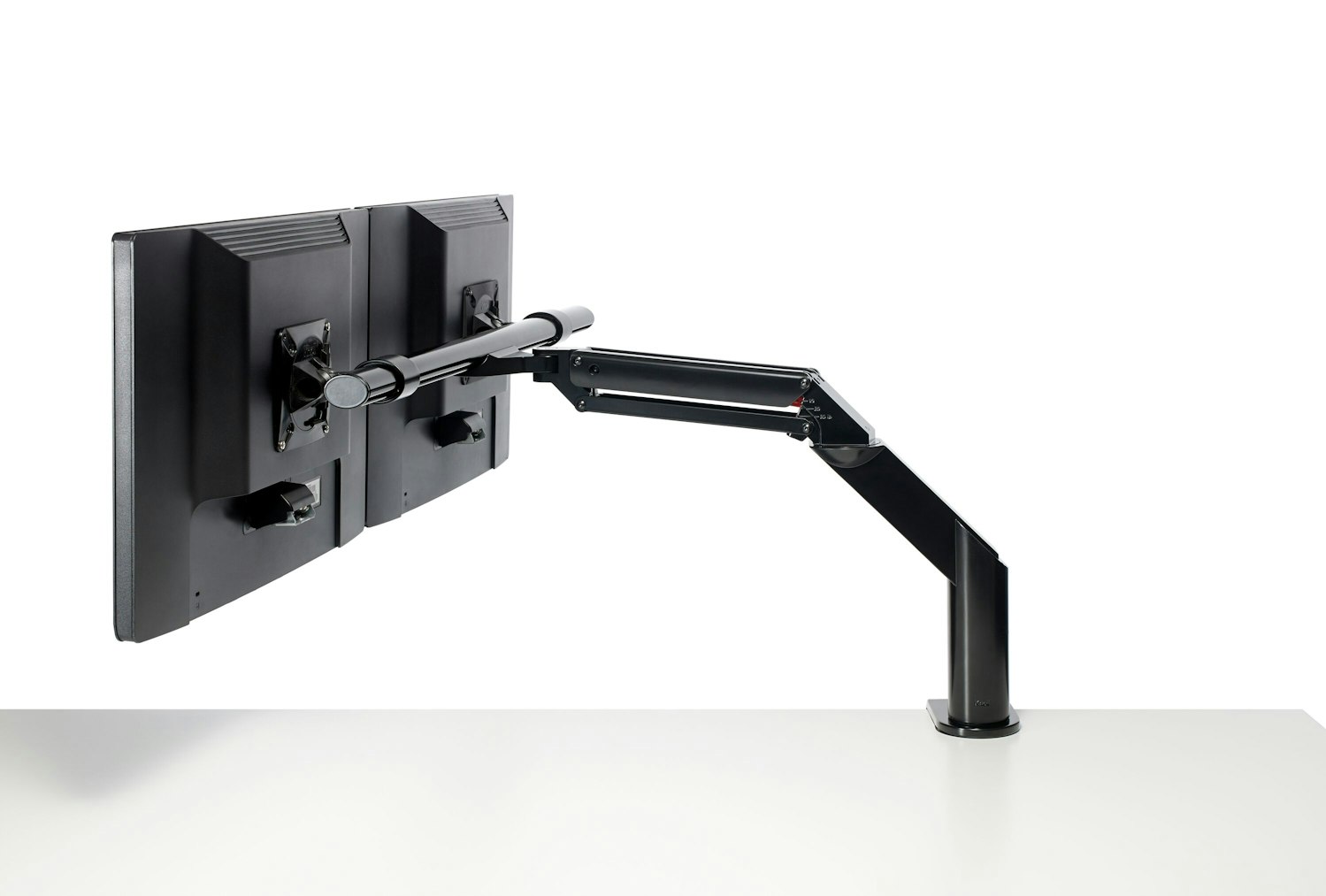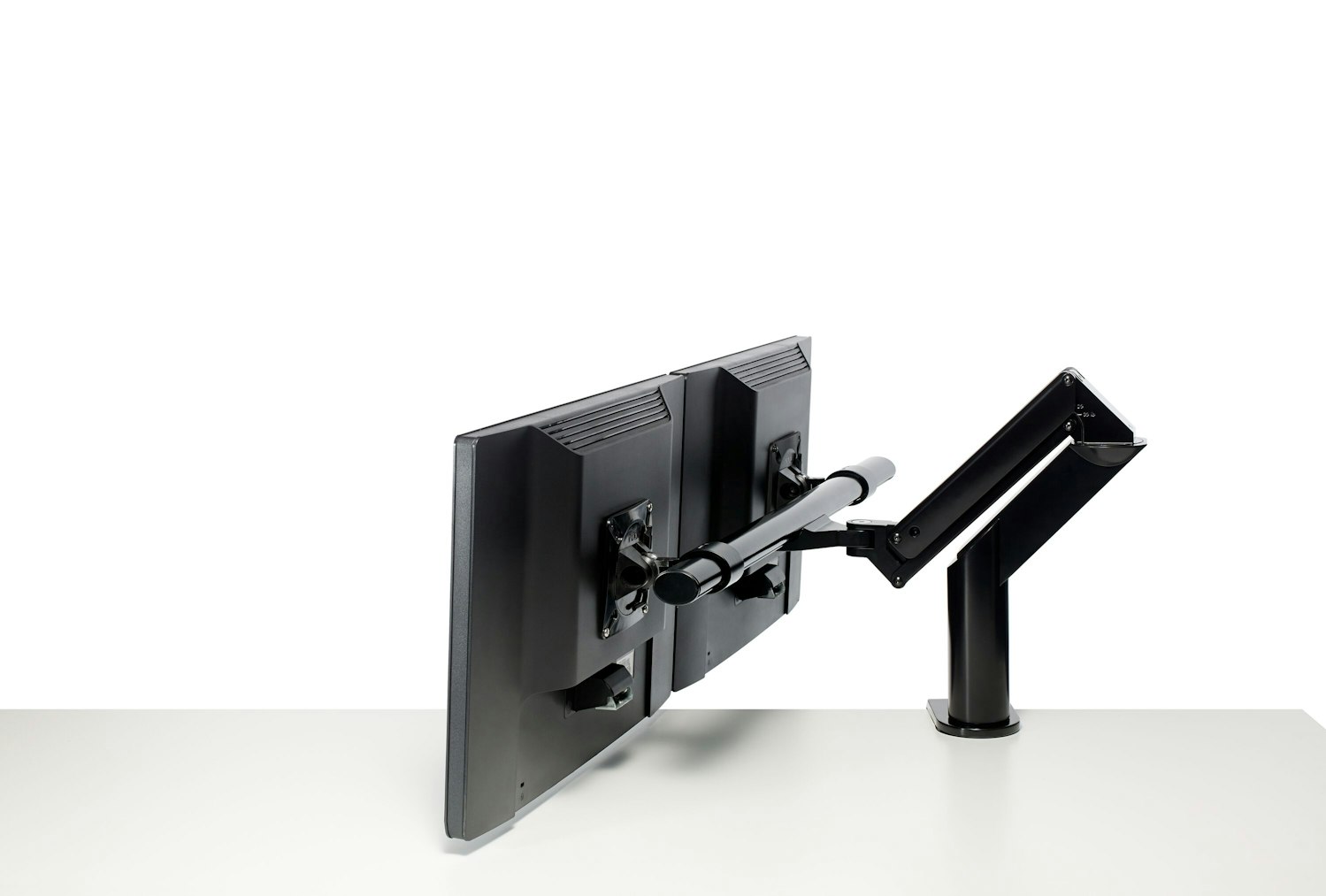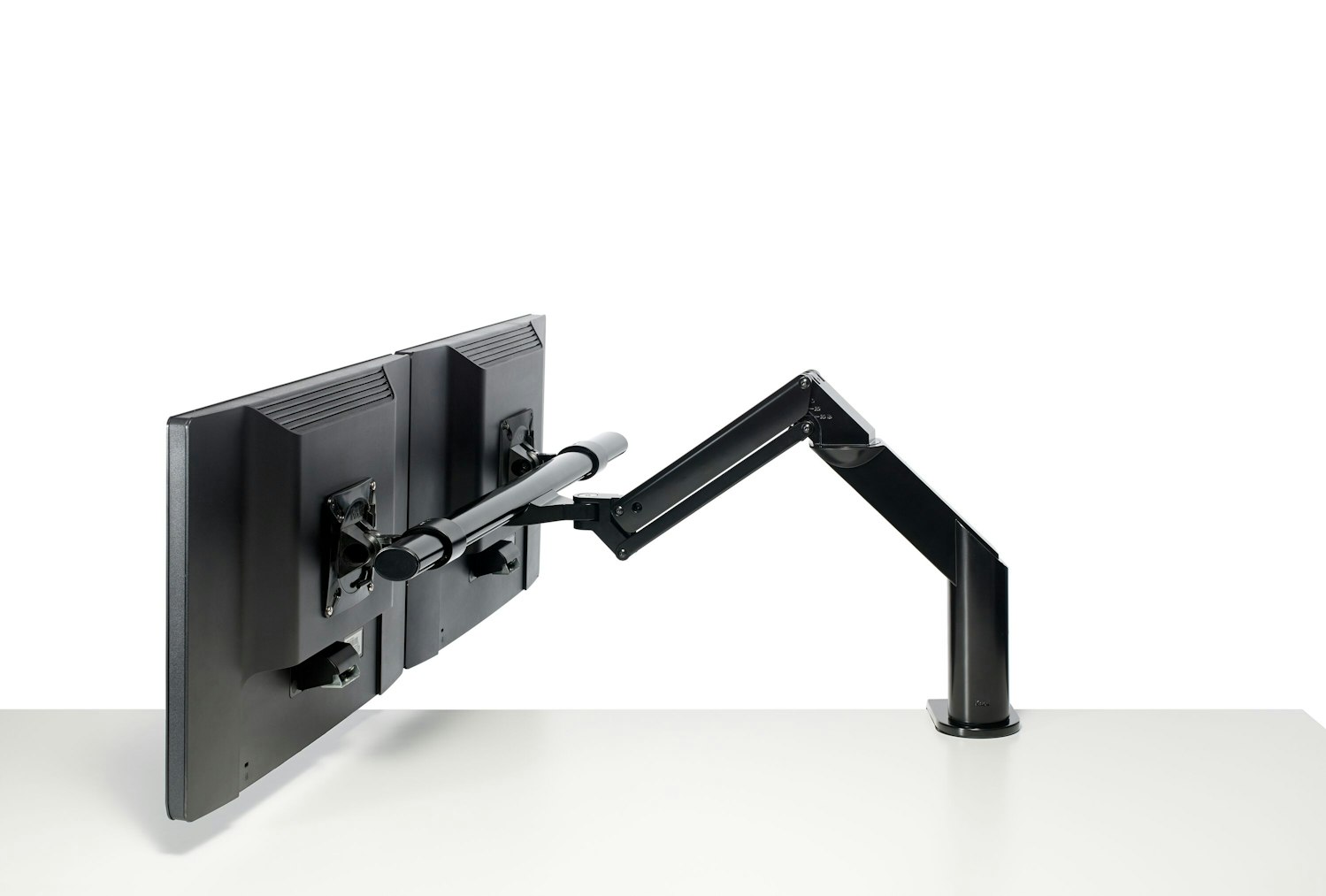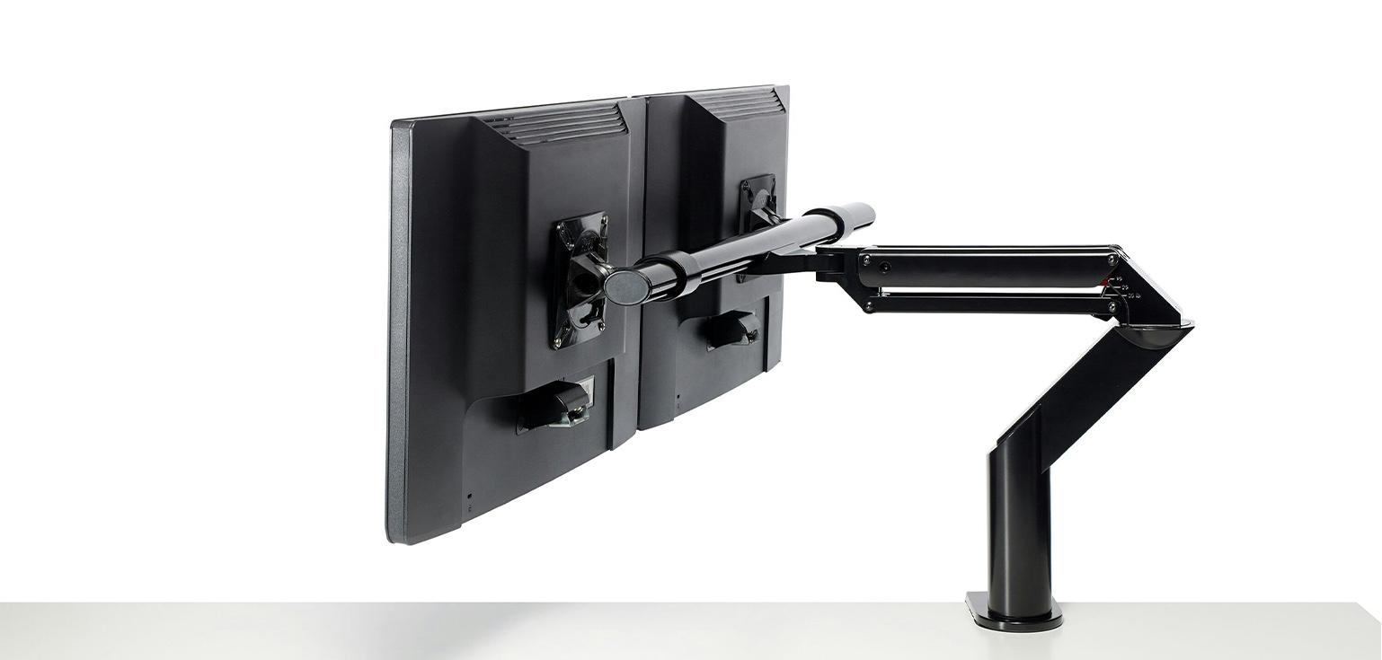 Both monitors move in tandem on the crossbar but retain the ability to tilt independently.