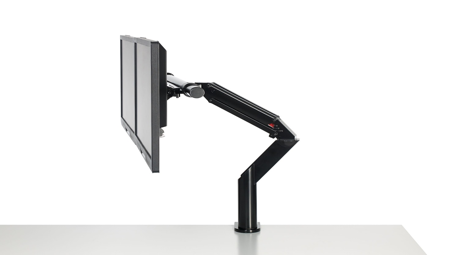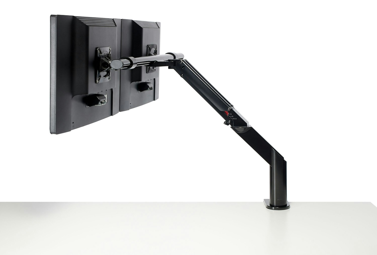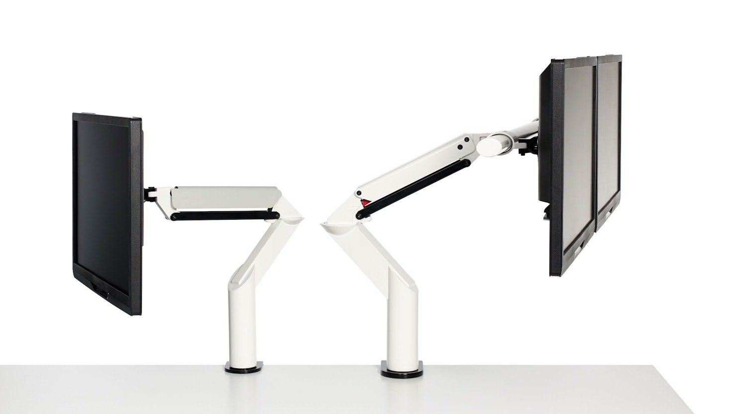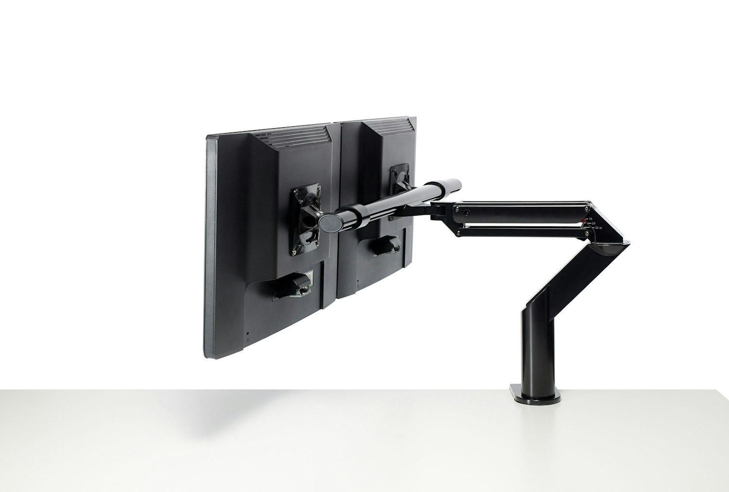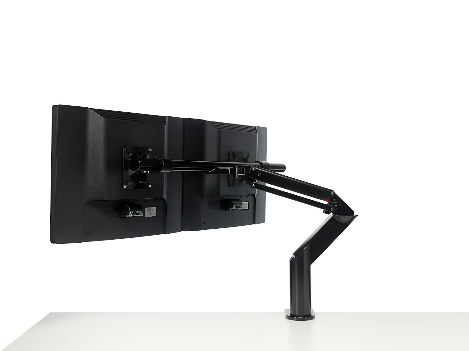 Both monitors move in tandem on the crossbar but retain the ability to tilt independently.