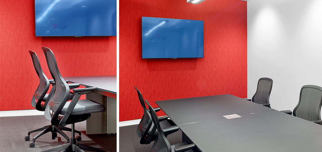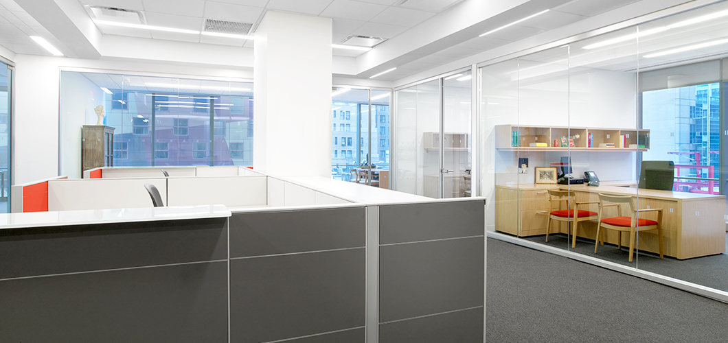 In the private perimeter offices, Reff Profiles was chosen for its transitional aesthetic and integrated technology support. Since both the private offices and the workstations would be visible at all times, the private office system had to be compatible with the clean lines of AutoStrada, while also projecting a more traditional and private space.