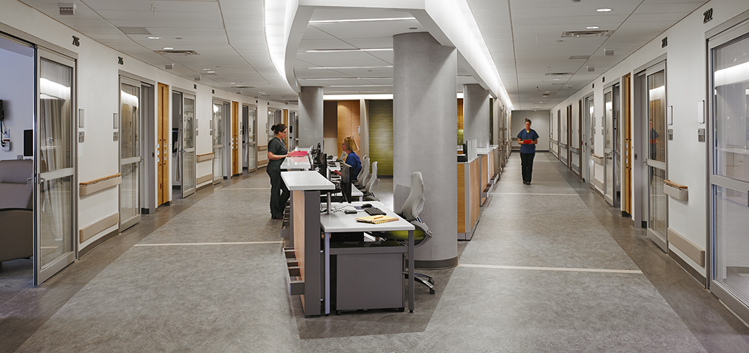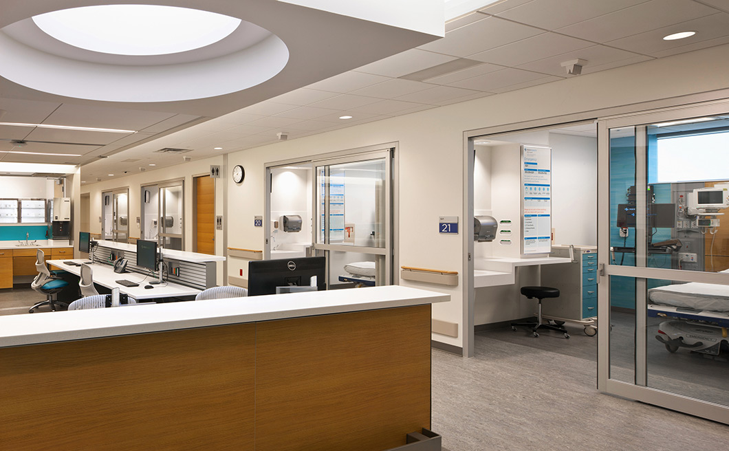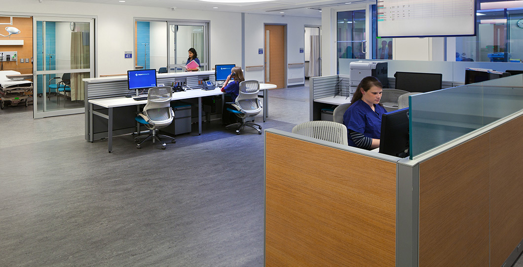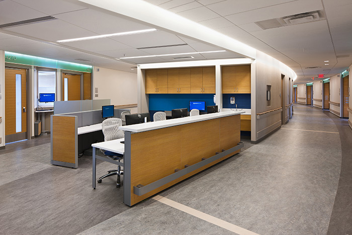 To carve out the necessary space to maintain the sense of openness in the interior, team workstations utilize a smaller footprint – reducing space per caregiver from 60 to 48 inches – in a compact layout that provides much greater mobility, according to designer Pudlock.