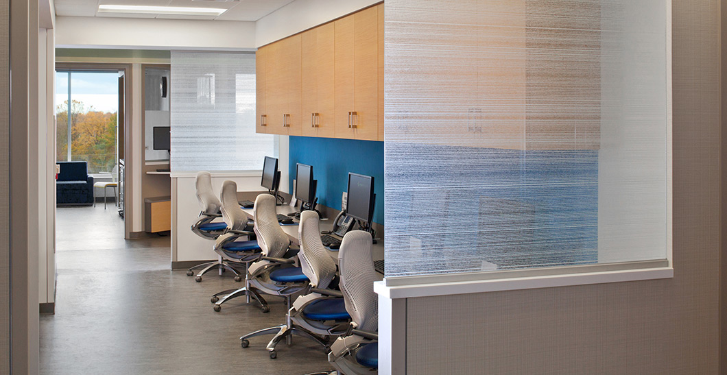 “Knoll was very accommodating when it came time to put the custom finishes in place,” Pudlock acknowledged. “For example, the horizontal grain laminate on the front face of the nurse’s station was not a standard finish, but very much part of the architectural language. Knoll was able to match the panel to the cabinetry and doors in a seamless manner.”