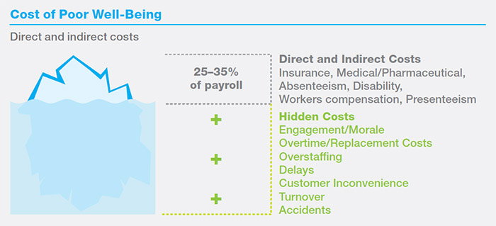 Figure 3. Research from Society for Human Resource Management (SHRM) and others suggest that the total direct and indirect cost of poor employee well-being can total 25% to 35% of payroll, but even that is just the tip of the iceberg.
