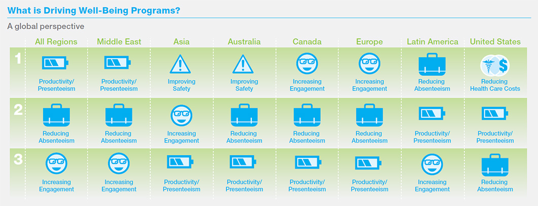 Figure 6. Top drivers of well-being program across the globe based on Buck Consultants’ (a Xerox company) survey of over 1,000 companies in 37 countries.