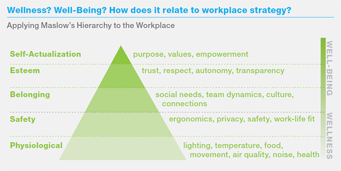In this framework, an employee’s physiological and safety needs serve as the foundation of the well-being pyramid. They are primarily related to the physical aspects of work and wellness: adequate lighting, thermal comfort, reasonable noise levels, sufficient privacy, etc. Employees are often dissatisfied when these basic needs are not met. But just as with Maslow’s original hierarchy, having them met, or exceeded, does not create satisfaction.