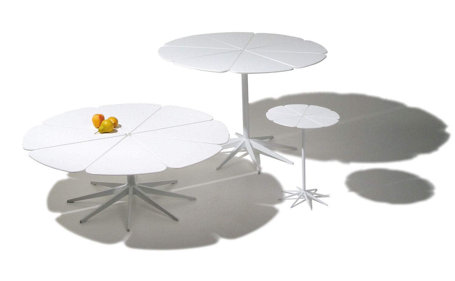 Richard Schultz cites Queen Anne’s Lace as his inspiration for this delicate outdoor table with its flower-like top sprouting from the elegant pedestal base. Each “petal” expands and contracts independently, ensuring stability in changing weather.