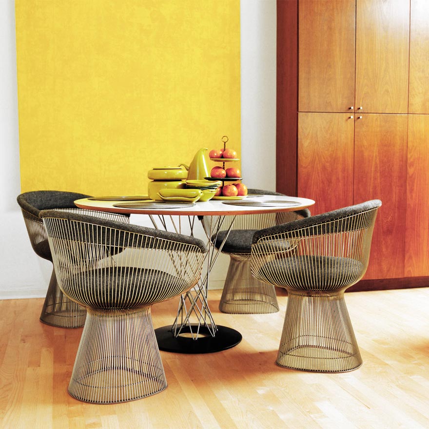 In the 1940s, Iasmu Noguchi began to experiment in furniture design. One of his designs, a rocking stool with a unique wire base, caught the eye of Hans Knoll who introduced the design, with a matching table, in 1955.