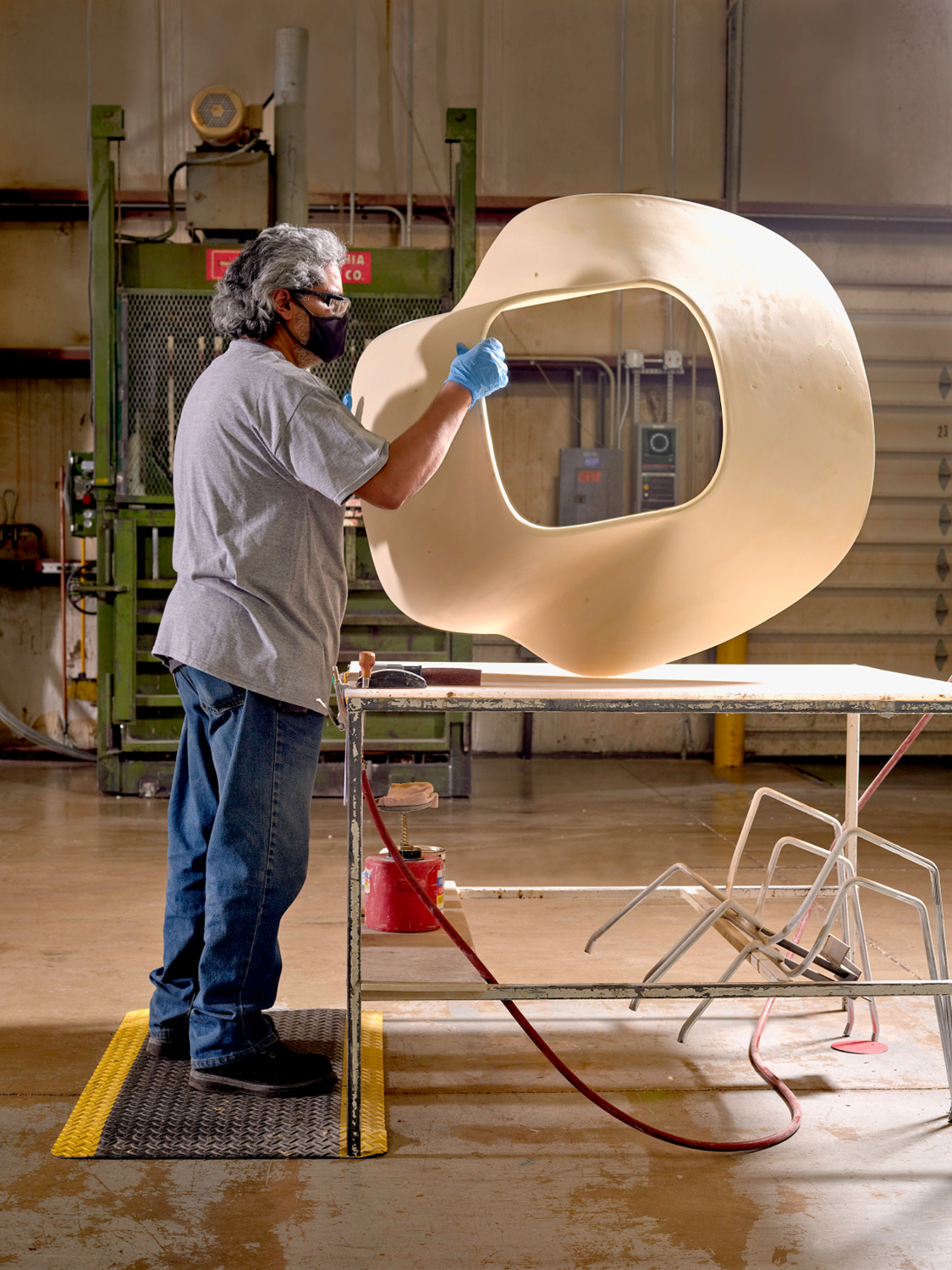 He and Florence heard of a New Jersey-based commercial shipbuilder who was experimenting with fiberglass and resin. After many iterations and prototypes, the fiberglass form was perfected. Coupled with ample armrests and a sweeping backrest, the comforting cup-like effect that Florence craved took shape.